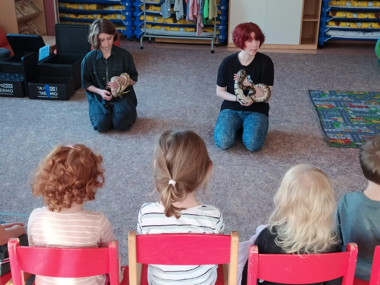 V rámci projektu Draci se učí jezdíme do škol či školek s našimi zvířaty, především plazy a prezentujeme jednotlivé druhy dětem.